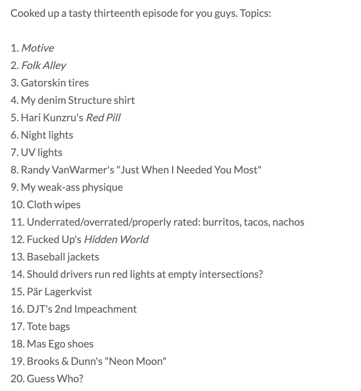 I had an enjoyable time talking chopsticks, Hari Kunzru, Brooks & Dunn, and more. Find the newest episode on Spotify, Apple Podcasts, or Buzzsprout.