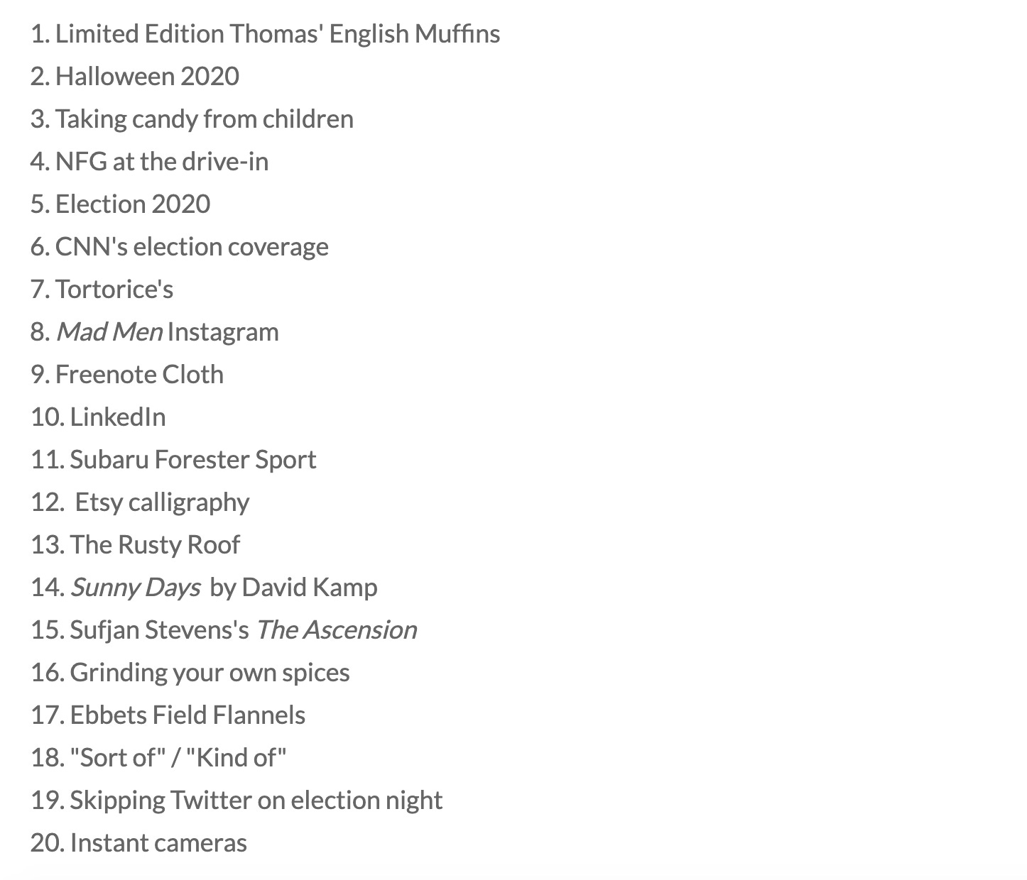 If you’re looking for a nuanced analysis of the election, avoid this week’s 20 in 20 at all costs. If you want to hear me talk about selvedge denim and New Found Glory and–why not–our dumb election, please consider listening to my episode 4. Topics include: